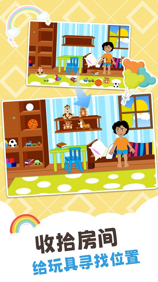 1、可爱的卡通画风,丰富的场景探索,各种各样的生活常识在玩耍中了解;