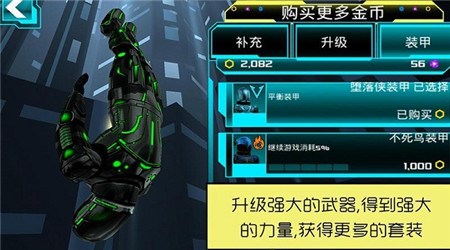 坠落侠的游戏模式整体感觉和跑酷类游戏差不多,只是该游戏是从天空往地底跑而已。游戏中可以收集的道具并不多,除了跟众多跑酷游戏一样可以收集方形的金币以外,还能收集紫色的能量珠。金币可以用来升级装备、购买新的服饰等,能量珠可以用来复活,这一点是比较有新意的,不然每次牺牲后都要重头再来,会很坑的。