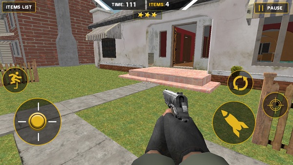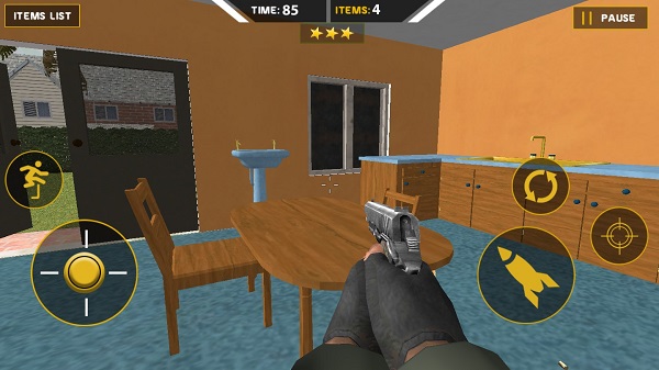 在游戏中,操作玩法非常简单,通过左侧的摇杆控制来移动目标,右侧是切换瞄准与射击的按钮,通过寻找当前关卡内指定的物品,进行搜索与破坏。