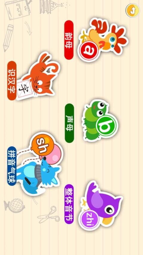 2、进入学习页面,可以选择韵母、识汉字、拼音气球等专区进行查看